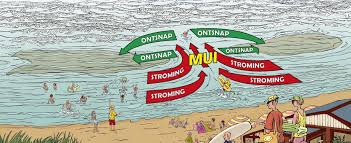 Maar je kan een mui herkennen: er slaan daar geen golven om en er is weinig schuim. Een mui kan tientallen meter breed zijn. Links en rechts van de mui zijn zandbanken, plekken met veel minder stroming. Een zandbank is een plek waarbij de grond hoger is omdat er - verrassing- veel zand ligt. Wat is een rip in zee? Een muistroom is een stroming in het water nabij de kust, die zeewaarts gericht is. De stroming vindt met name plaats in de openingen tussen de zandbanken of de diepere gedeeltes op het strand.