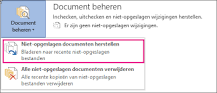 Ga naar Bestand >Info > Document beheren > Niet-opgeslagen documenten herstellen. Selecteer het bestand en selecteer openen.